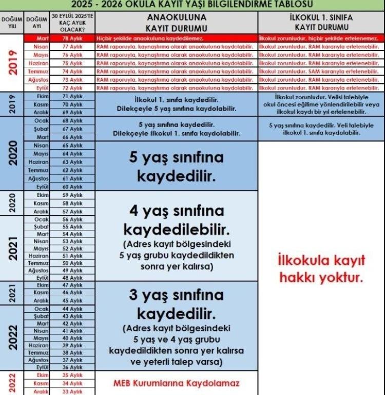 Değerli velilerimiz, 2025 - 2026 Eğitim Öğretim yılı için öğrencinin hangi sınıfa kaydolabileceğini açıklayan tablomuz aşağıda mevcuttur. Öğrencinin doğduğu yıl ve aya göre, 2025 Eylül tarihinde kaç aylık olacağına göre okula kayıt yaşı hesaplanmaktadır.